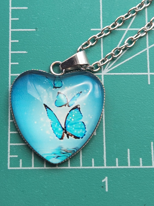 Three Blue Butterfly Pattern with Heart Shape Glass Necklace